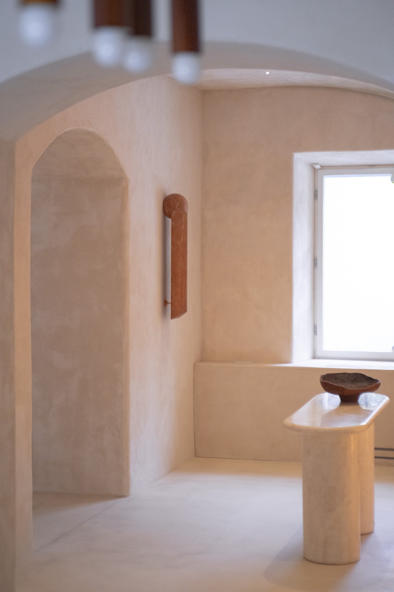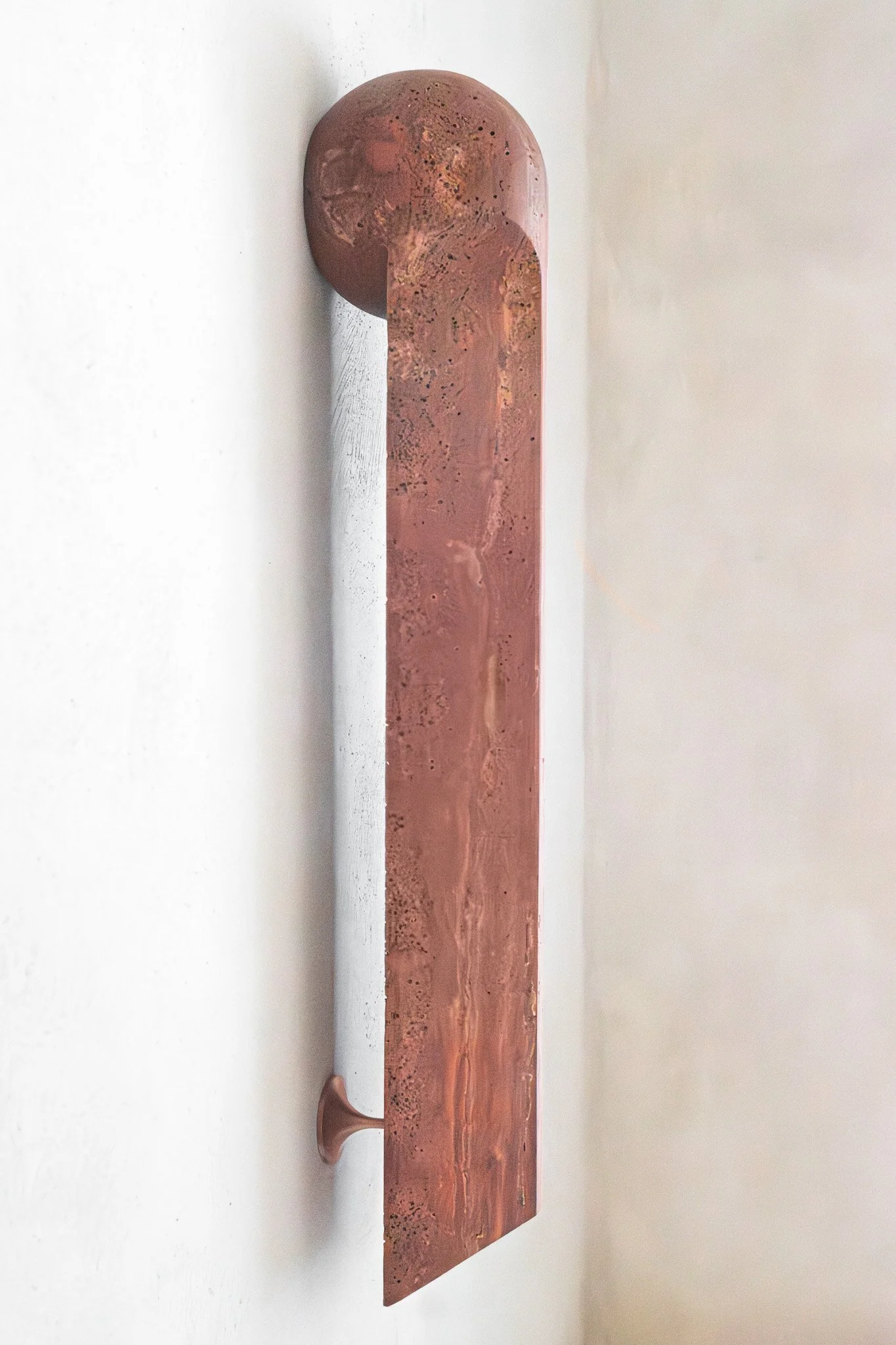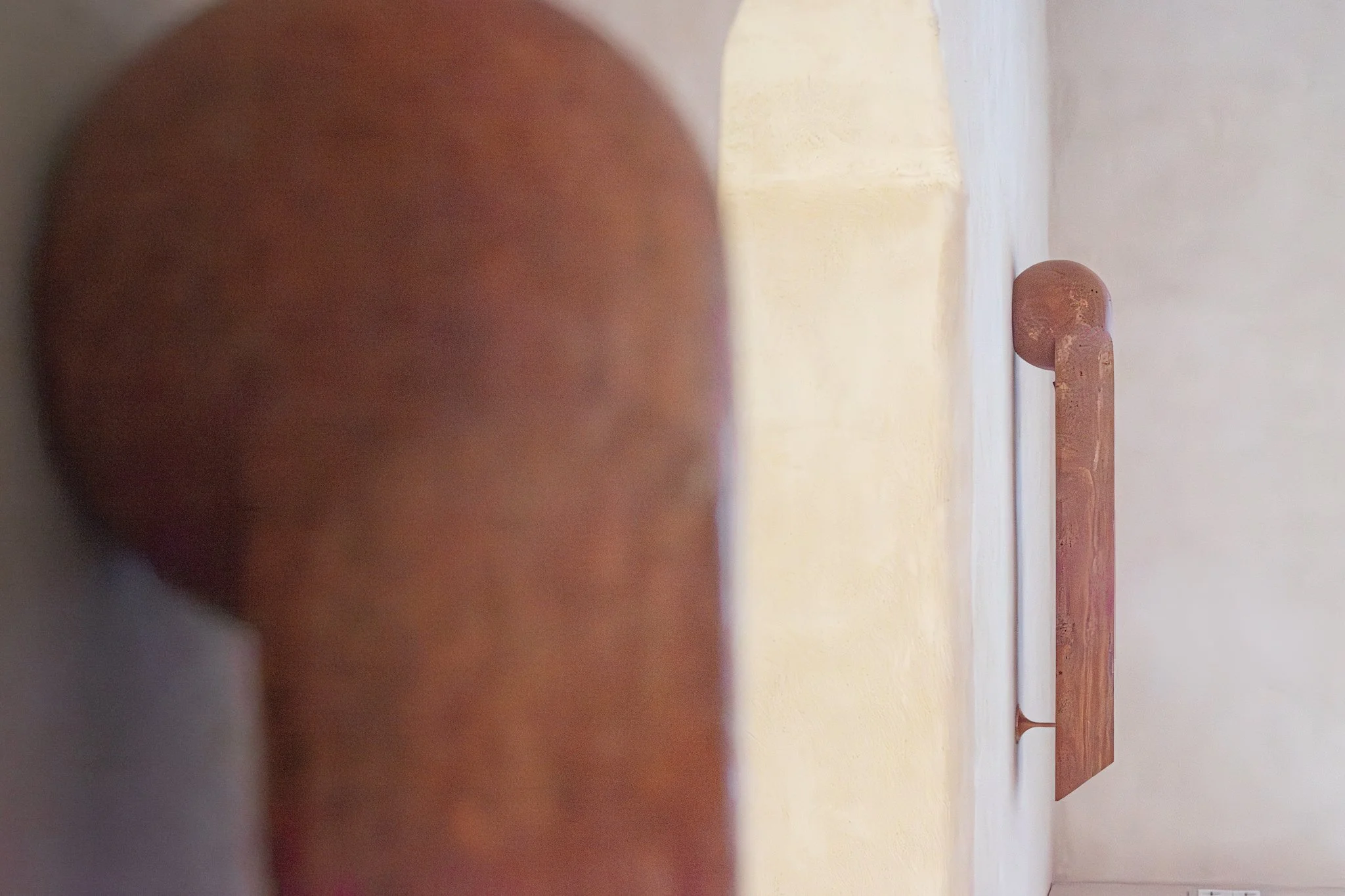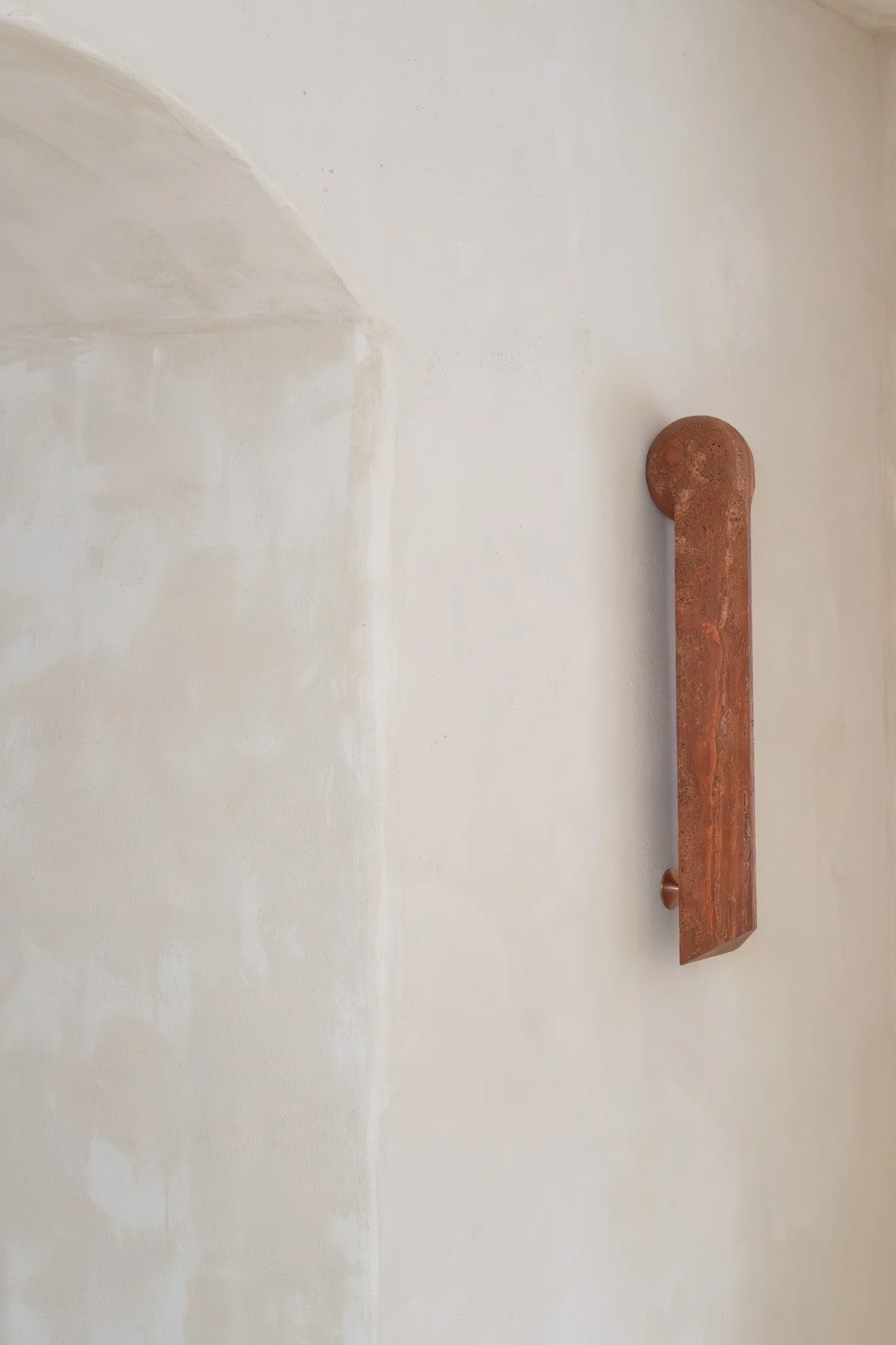 BABALU’s massive, vertical form evokes the abstract silhouette of a human head, serving as a symbol of the primal connection between humanity and nature. The piece functions like a contemporary talisman - silent, rooted in matter. The design draws on ancient beliefs in the power of natural forms. In Slavic tradition, stones found in fields, known as “Stone Babas,” were regarded as sacred, emerging from the earth with its constant movement. They were cared for and honoured through ritual, believed to influence the fertility of the soil and ensure a rich harvest. This sconce pays tribute to that enduring dialogue between nature and human imagination. Carved entirely from travertino rosso, this piece prevail the space it appears in.